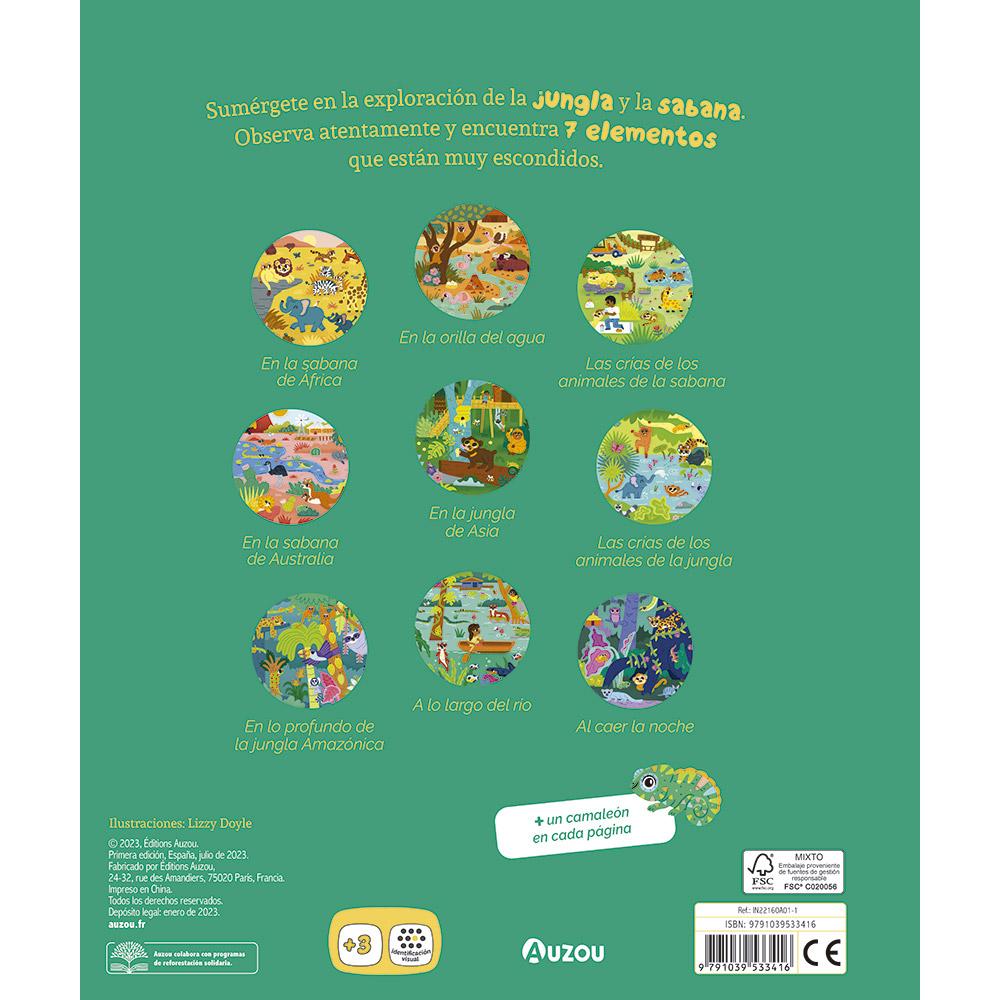 ¡Sumérgete en la exploración de la jungla y la sabana! Una colección de Busca y Encuentra para los más pequeños con ilustraciones repletas de detalles. ¡Observa atentamente y encuentra 7 elementos que están muy escondidos en cada página! ¡Ideal para desarrollar el sentido de la observación en los más pequeños! ¿Serás capaz de encontrar al pequeño camaleón que se esconde en cada página?