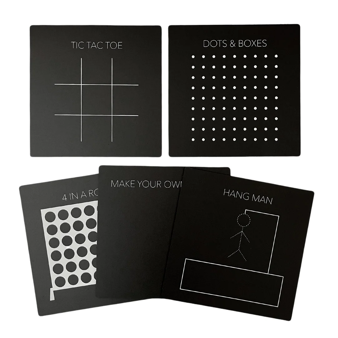 El reverso de cada pizarra es liso, perfecto para dibujar, anotar ideas o crear nuevos juegos. Para borrar, basta con pasar un paño húmedo, lo que permite reutilizarlas tantas veces como se desee.
