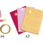 Contenido: 4 diademas ilustradas de cartón, 3 hojas de pegatinas de espuma de mosaico con purpurina, 4 hojas de pegatinas de «piedras preciosas», 4 cintas doradas, 1 folleto explicativo.