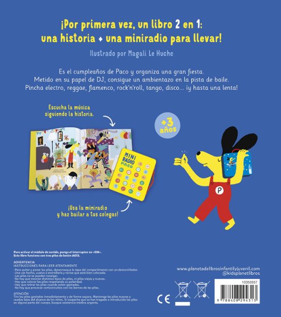 ¡Es el décimo cumpleaños de nuestro queridísimo Paco y para celebrarlo organiza una fiesta en la que descubriremos sus dotes como disc-jockey! Pinchará muchos de sus estilos de música favoritos: electro, reggae, flamenco, rock’n’roll, tango, disco ¡y muchos más! Y para que nunca pierdas el ritmo, este libro viene con una miniradio que podrás llevarte a todas partes, y con la que podrás escuchar 20 melodías que crean un superambientazo en la pista de baile. ¡Anima a tus colegas a bailar!