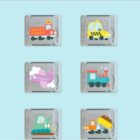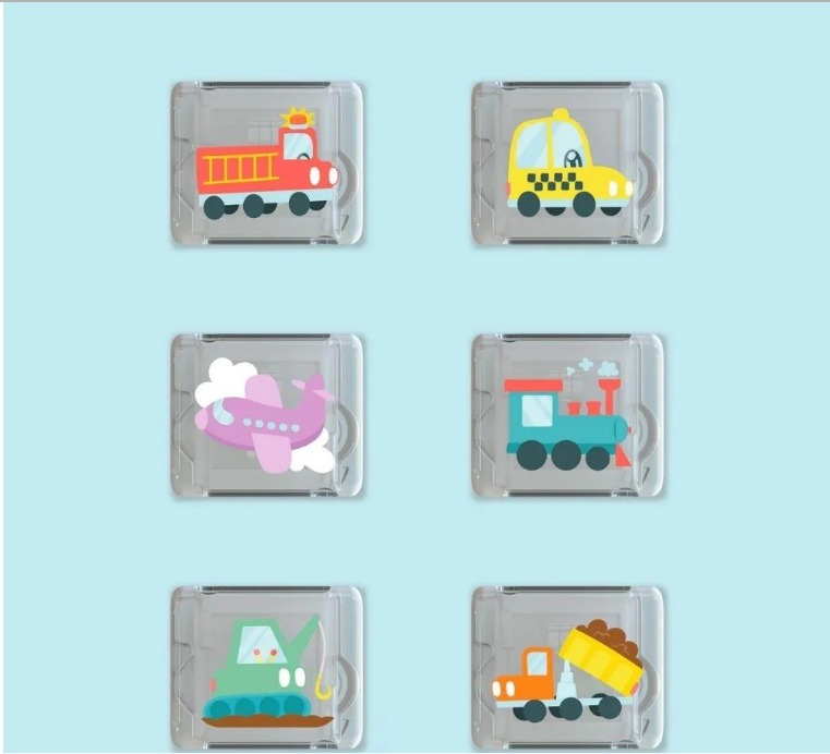 - 6 cubos luminosos con diseños temáticos: camión de bomberos, taxi, excavadora, avión, tren, camión volquete