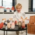 Las pequeñas manos desarrollan coordinación mientras exploran distintas texturas y caritas bordadas. Los detalles acabados a mano y las bases con peso garantizan que estos amigos de 16–20 cm siempre estén listos para el siguiente juego de derribos.
