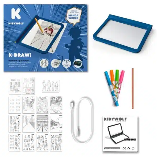 La Kidydraw Pro Azul de Kidywolf es una herramienta creativa para los niños que quieren aprender a dibujar al estilo manga trazando y creando sus propios personajes. Con su diseño portátil, tamaño A4 y sistema de doble cara, permite dibujar, calcar y experimentar con estilos de forma fácil, cómoda y creativa.