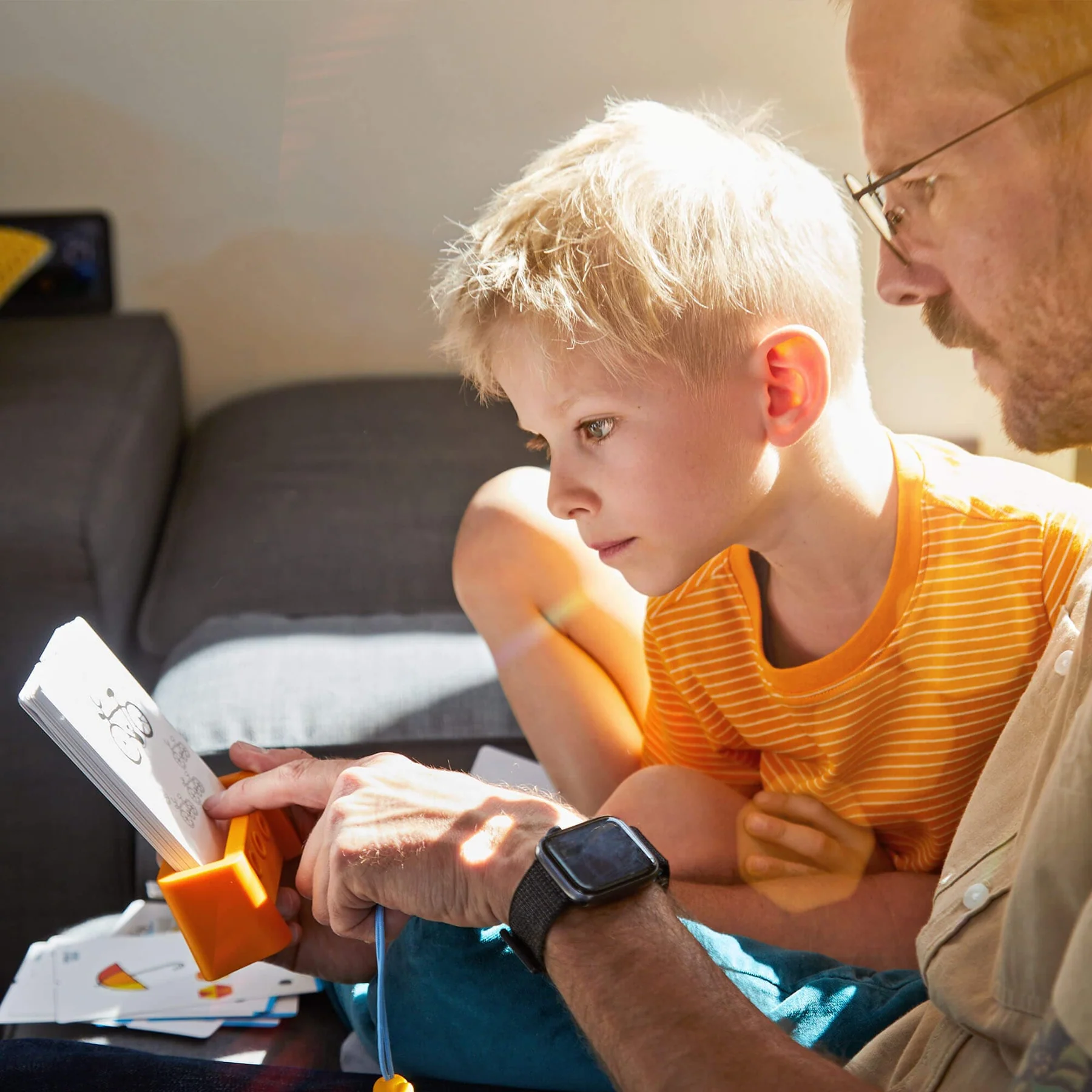 Diseñado para el aprendizaje en movimiento y los viajes, el sistema incorpora un cordón azul que mantiene unida la clavija de madera y permite envolver las tarjetas, asegurándolas mediante un tope para un transporte cómodo y seguro.