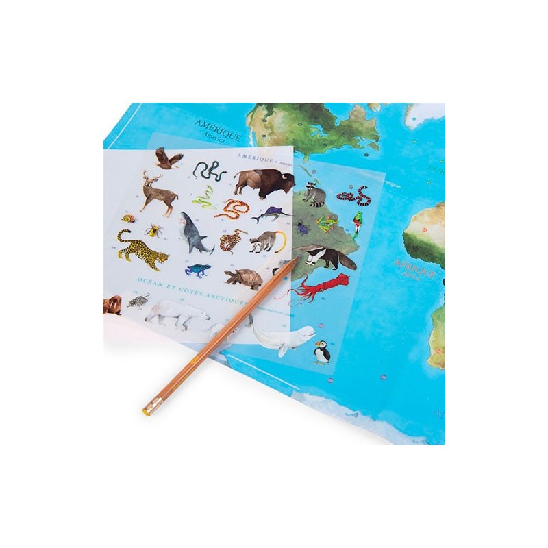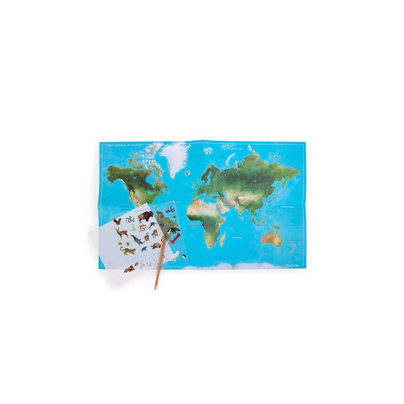 ¡Un viaje alrededor del mundo sin salir de casa! Este precioso mapa ilustrado de Moulin Roty invita a los niños a explorar los continentes a través de más de 100 calcomanías. Con un estilo artístico único, deberán encontrar el lugar de cada animal y planta, transfiriéndolos al mapa con un lápiz. Una actividad relajante que fomenta la observación y decora su habitación con estilo. ¡Exploración y arte en un solo set!