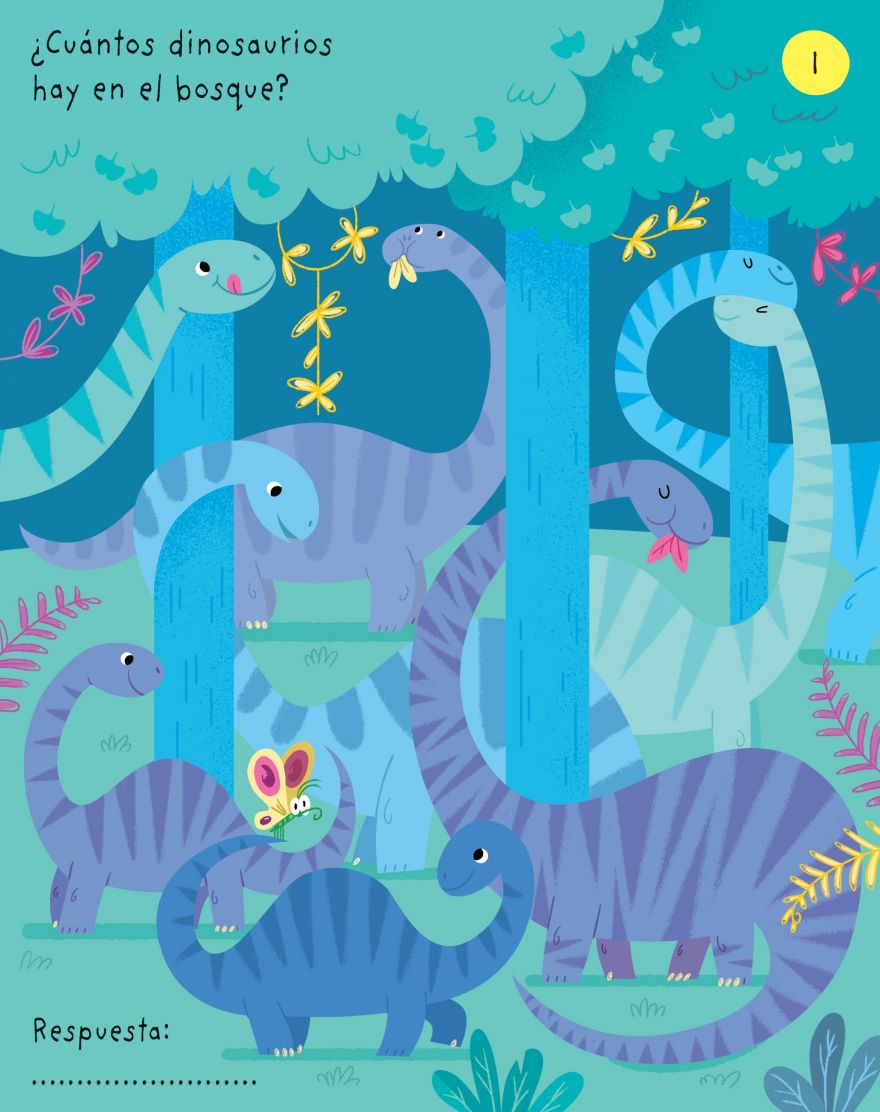 Libro de actividades inspirado en el mundo de los dinosaurios, con sopas de letras, adivinanzas, busca las diferencias, laberintos y mucho más.