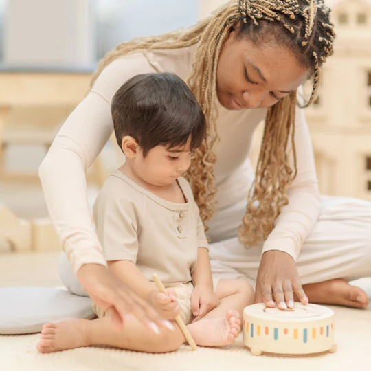 Este tambor invita a los peques a explorar el sonido mientras descubren ritmos, golpes y secuencias de forma natural. Al experimentar con distintos tipos de pulsaciones, desarrollan la coordinación ojo-mano, mejoran tanto la motricidad fina como la gruesa y aprenden a controlar la fuerza con la que golpean.